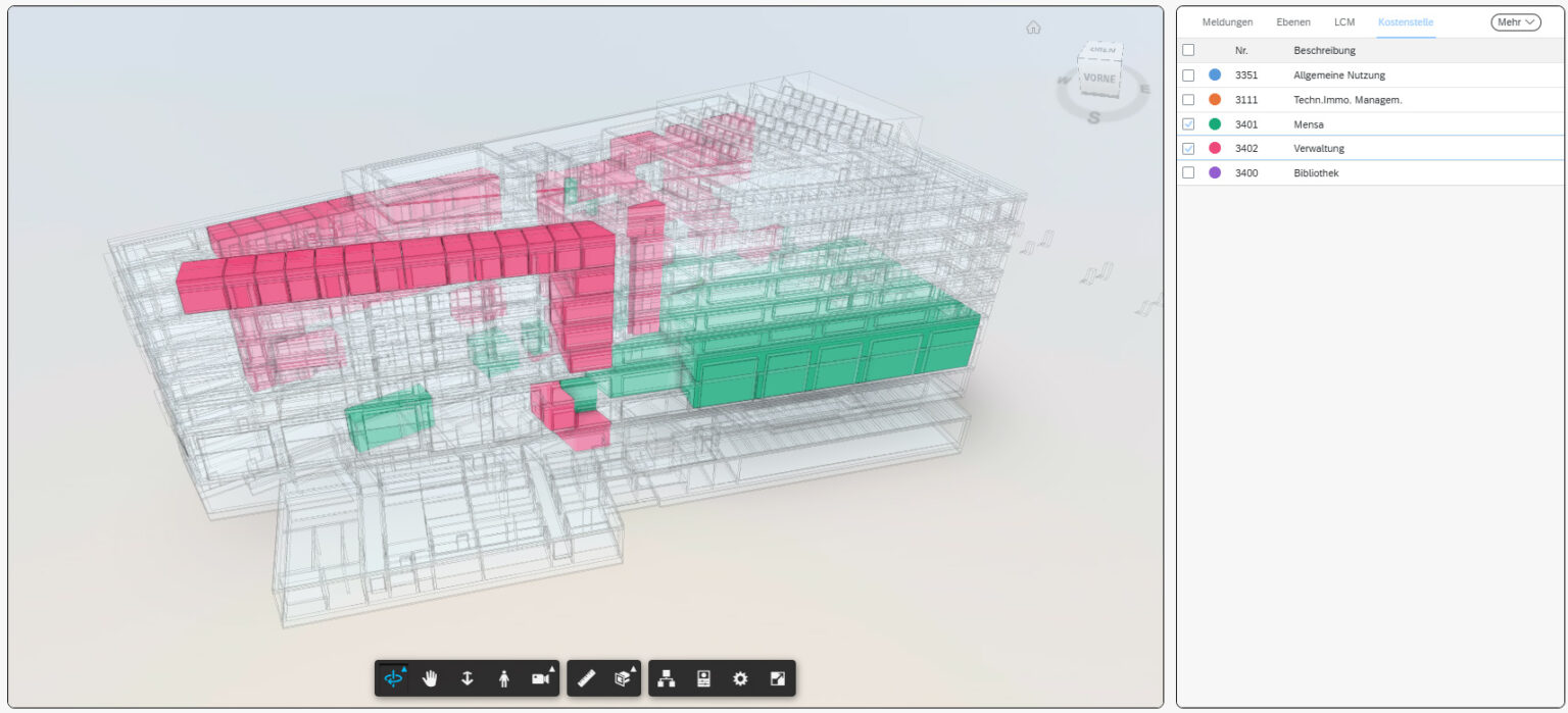 Interaktive Modellansichten und vielseitige Filterfunktionen erleichtern die Navigation, Analyse und Auswertung von Gebäude- und Grundflächen, zum Beispiel nach Energieverbrauch, Technischer Ausstattung oder Kostengruppe. Die durch BIM@FM bereitgestellte Fachansicht beinhaltet zudem Funktionen wie 1st Person View, Modellschnitte oder integrierte Messwerkzeuge. Diese unterstützen eine detaillierte Betrachtung und Prüfung der Gebäudedaten und erleichtern unter anderem Analysen für Renovierungen sowie die exakte Bestimmung von Maßen Technischer Anlagen.